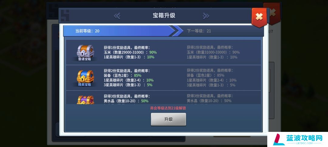 4、商会很重要,决定每天宝箱数量和开宝箱获得的物质品质,所以商会等级能拉多高拉多高。蓝色装备宝箱建议商会13级后左右在开否则很亏,13级后开获得蓝色一星装备,或者20级后再开,20级后开获得蓝色2星装备,自己决定。
