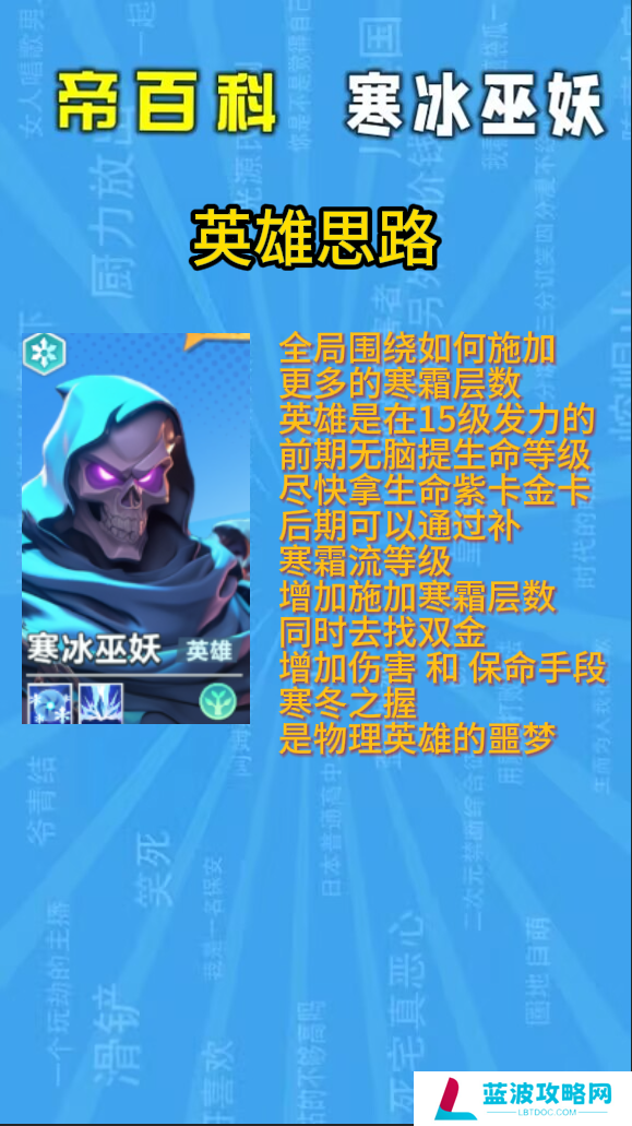 全局围绕如何施加,更多的寒霜层数,英雄是在15级发力的,前期无脑提生命等级,尽快拿生命紫卡金卡,后期可以通过补,寒霜流等级,增加施加寒霜层数,同时去找双金,增加伤害 和保命手段,寒冬之握是物理英雄的噩梦
