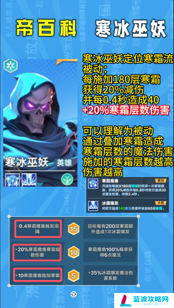 本次给大家带来了《口袋斗蛐蛐》寒冰巫妖玩法攻略!寒冰巫妖定位寒霜流,被动:每施加180层寒霜,获得20%减伤,并每0.4秒造成40,+20%寒霜层数伤害,可以理解为被动,通过叠加寒霜造成,寒霜层数的魔法伤害,施加的寒霜层数越高伤害越高。