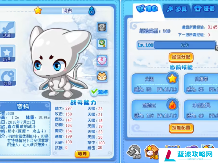 特殊技能有催眠尾巴和火焰喷发,催眠尾巴使用后,有几率让对手陷入睡眠状态,在战斗中当阿布的血量较低或者需要争取时间回复状态时,使用催眠尾巴控制住对手,为自己创造喘息的机会,火焰喷发是高威力的攻击技能,可作为主要输出手段,在面对一些没有特殊防御机制的普通宠物时,火焰喷发能快速造成大量伤害,解决战斗。