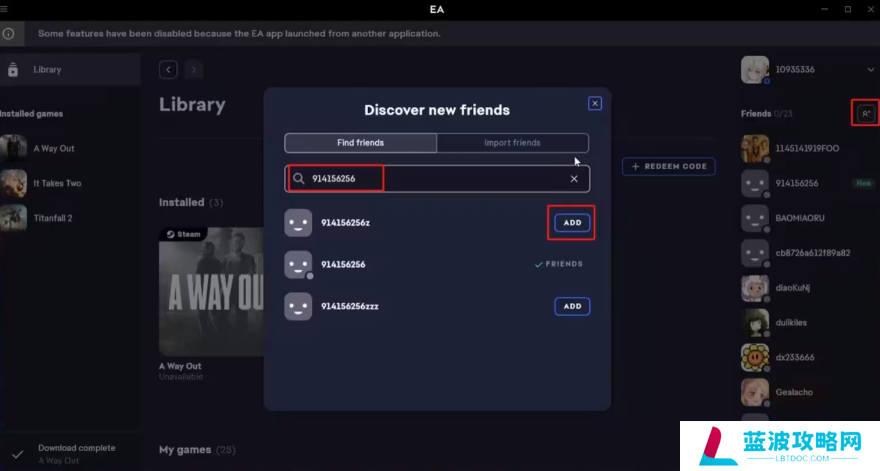 1、两名玩家都要在EA中绑定Steam,再从Steam中导入好友。
