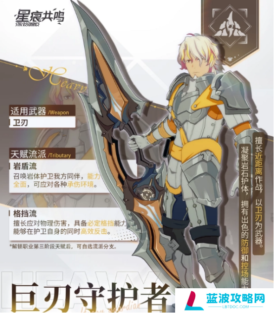 星痕共鸣坦克职业其实也就是巨刃守护者,在作战时会经常使用战刃的武器,将其他敌人彻底消灭,而且还会拥有雄厚的力量,尤其在团战时,会将最强的优势和作用展现出来。玩家首选的职业就是此职业,在不同的战斗场景中,可以随意挥舞着手中的战刃,参与刺激的作战当中拥有着极强的作战能力以及控制能力,为整个团队带来了极好的护盾以及减伤作用。