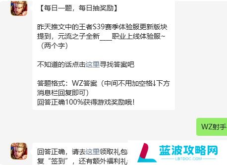 一、问题:昨天推文中的王者S39赛季体验服更新版块提到,元流之子全新____职业上线体验服(两个字)。