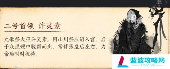 九歌祭大巫许灵素,因山川祭应诏入宫,后于众巫觋中脱颖而出,常伴张皇后左右,为帝后时时祝祷。