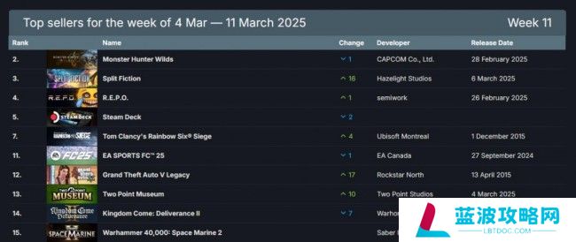 Steam 2025年最新一周游戏销量排行榜出炉(2025年3月4日-2025年3月12日,无免费游戏),本周依旧是《怪物猎人:荒野》登顶,目前该作已达成三连冠,《双人成行》开发商新作《双影奇境》以及《双点博物馆》也登上了榜单,分别位于第二和第八。