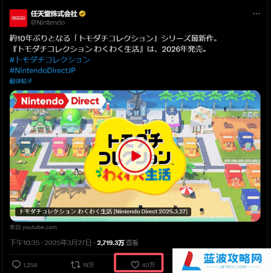 值得一提的是,截止至发稿时,任天堂推特官宣本作的推文点赞量已经突破了40万次!这一数字甚至超越了此前官宣Switch2的文章,成为任天堂有史以来点赞数最多的推文。