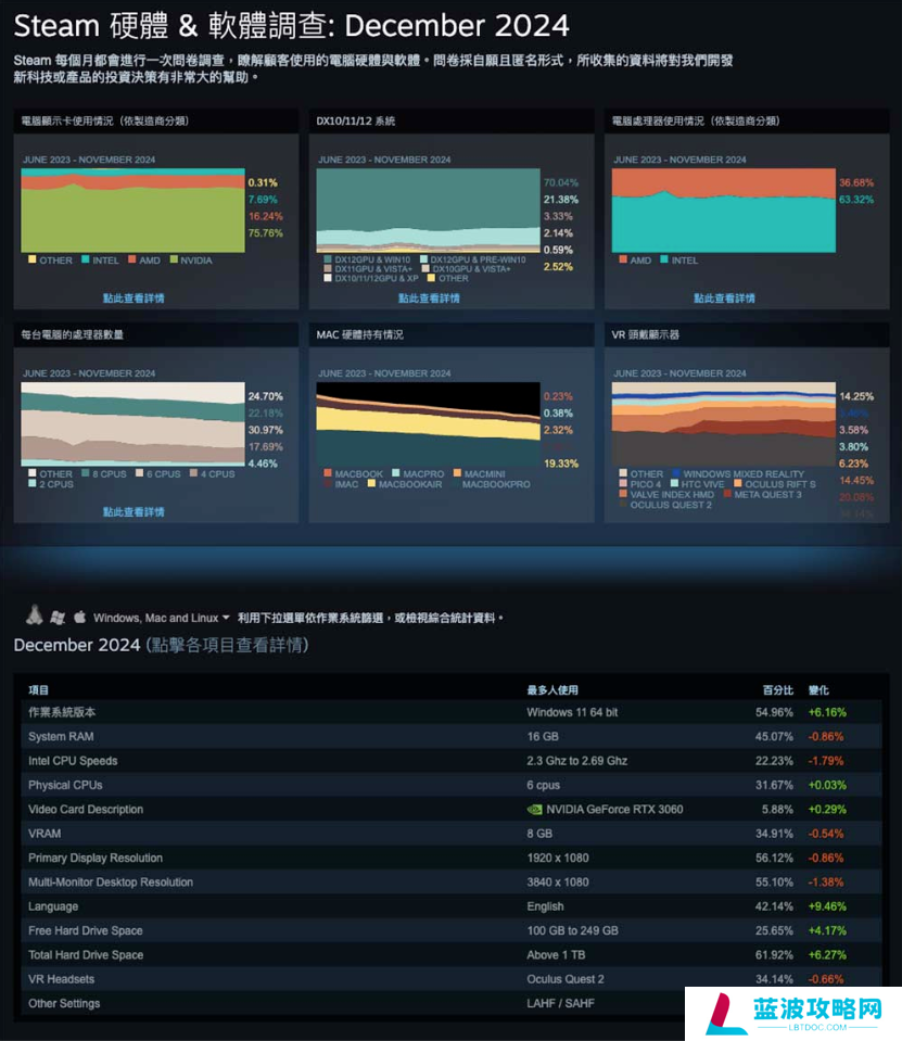 Steam硬件&软件调查:February 2025已经公开,有兴趣观看全部统计资料可至官方网页查询。