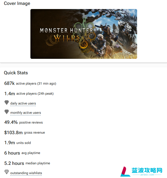 据国外数据分析公司VG Insights数据显示,截至发稿前,《怪物猎人:荒野》在Steam平台的销量已达到190万份,销售额突破1.03亿美元(约7.5亿元RMB),且游戏在Steam的平均时长为6小时。
