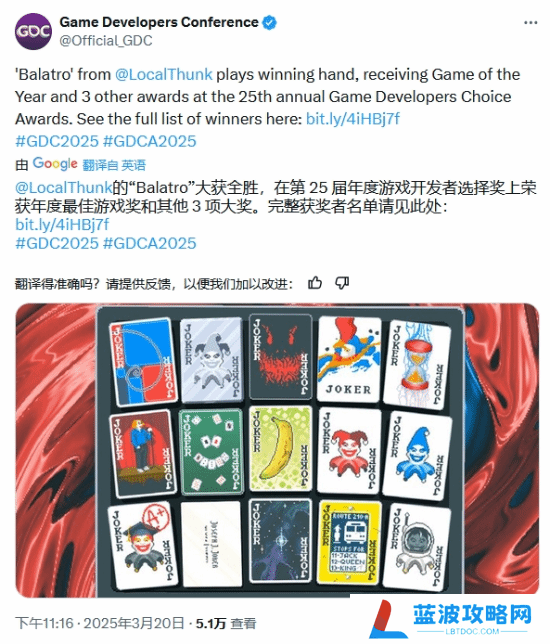 《小丑牌》在GDC上斩获了四项游戏大奖,包括年度最佳游戏奖、最佳出道作奖、最佳设计奖及创新奖四个重要奖项,获得了评审的高度认可。然而,尽管作者本人LocalThunk确实到场参与GDC,但他却一如往常,并没有登台领奖。