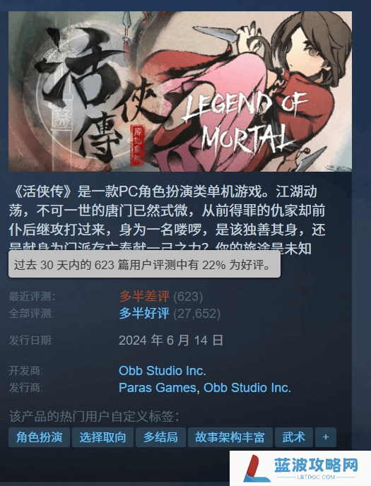 而根据Steam商店页面显示,自从3月28日游戏更新后,《活侠传》就迎来了大量的差评,游戏目前的近期评价已经为“多半差评”,好评率仅为22%。
