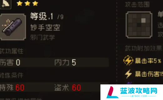 这样再把这个情况告知给鬼手之后,他就会传授给玩家妙手空空这个武学,通过这个武学在游戏里**武功秘籍,获得大量的游戏资源,想要掌握妙手空空,首先玩家的偷盗等级需要比较高,另外角色还需要尽力提升自己的悟性,只有这样才能灵活使用妙手空空,只不过使用这个武学是有一定弊端的,玩家需要时刻让自己的道德值保持在五以下,等到可以灵活掌握之后,再通过选择增加道德值的选项,恢复自己的道德值。